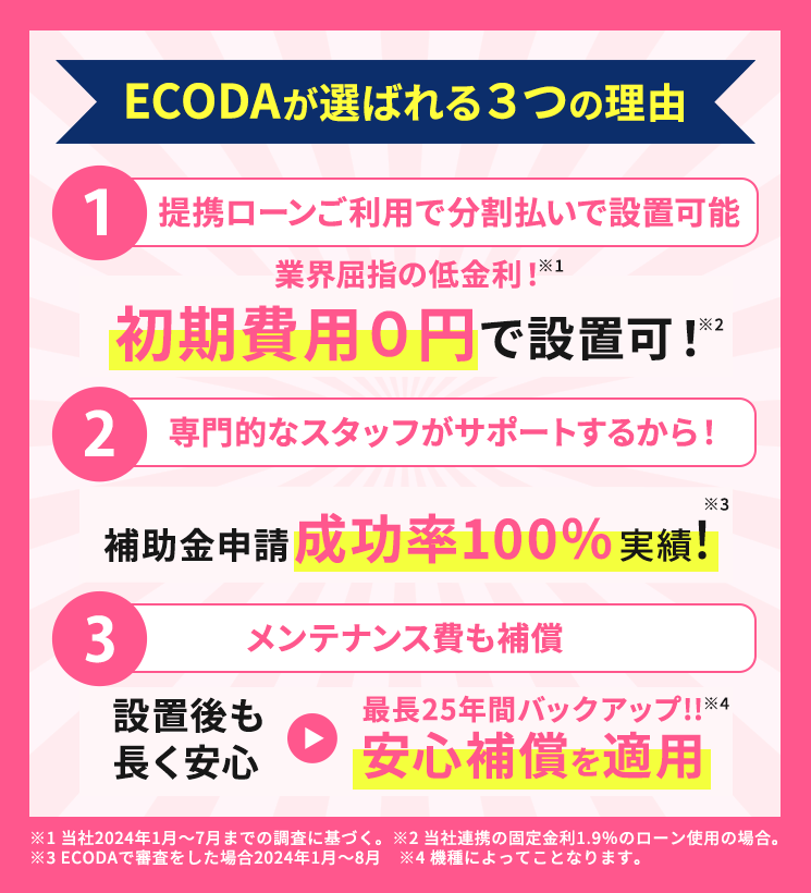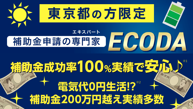 東京都で太陽光発電を検討している方におすすめなのが、補助金活用に強い「ECODA(エコダ)」です。自家消費率の最大化を図るシステム提案と、手厚い補助金サポートで注目を集めています。