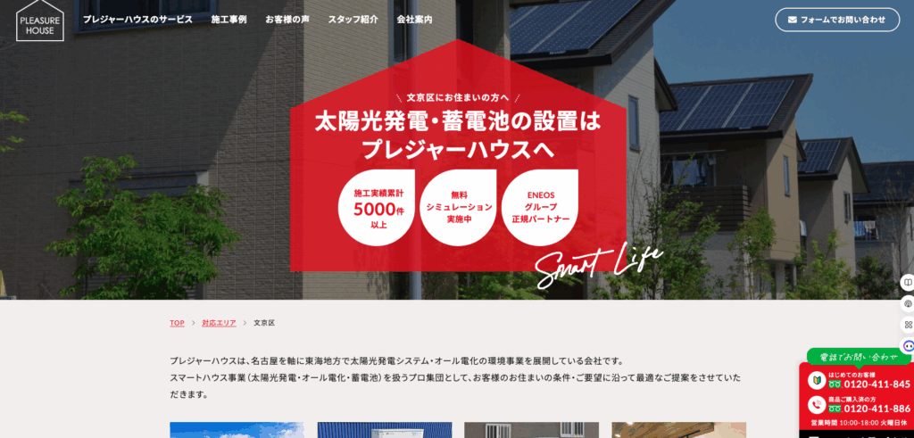 プレジャーハウスは、文京区を含む東京エリアで、太陽光発電システムの販売・設置から、その後のメンテナンス・補助金対応まで一貫して対応する施工会社です。住宅の屋根条件に応じた柔軟な設計提案と、施工後のフォロー体制が整っており、「導入後も安心」を重視する人に適しています。