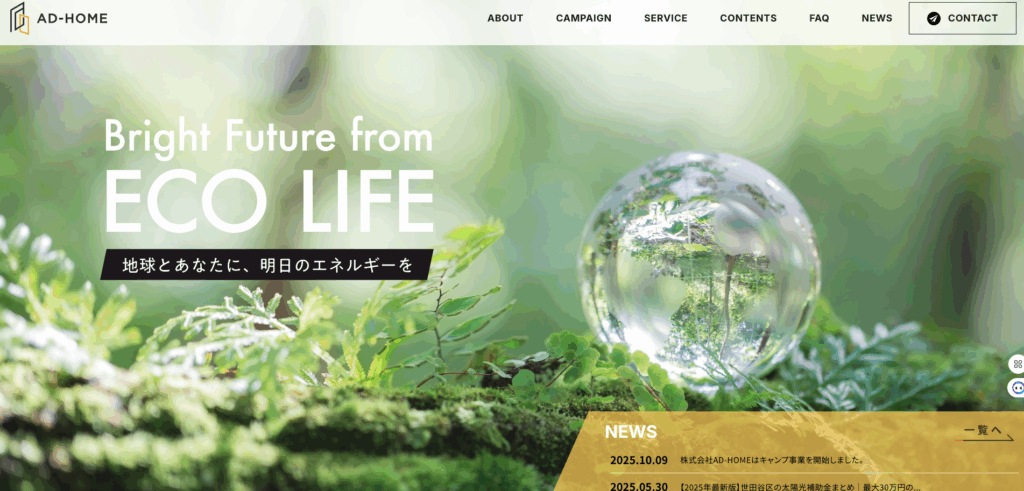 AD-HOME は世田谷区で、太陽光発電システムおよび蓄電池の設置を含む住宅向けエネルギー設備の施工を行っている会社です。導入後のアフターサービスやサポート体制が整っており、初めて太陽光+蓄電池を導入する家庭でも比較的安心できる選択肢です。